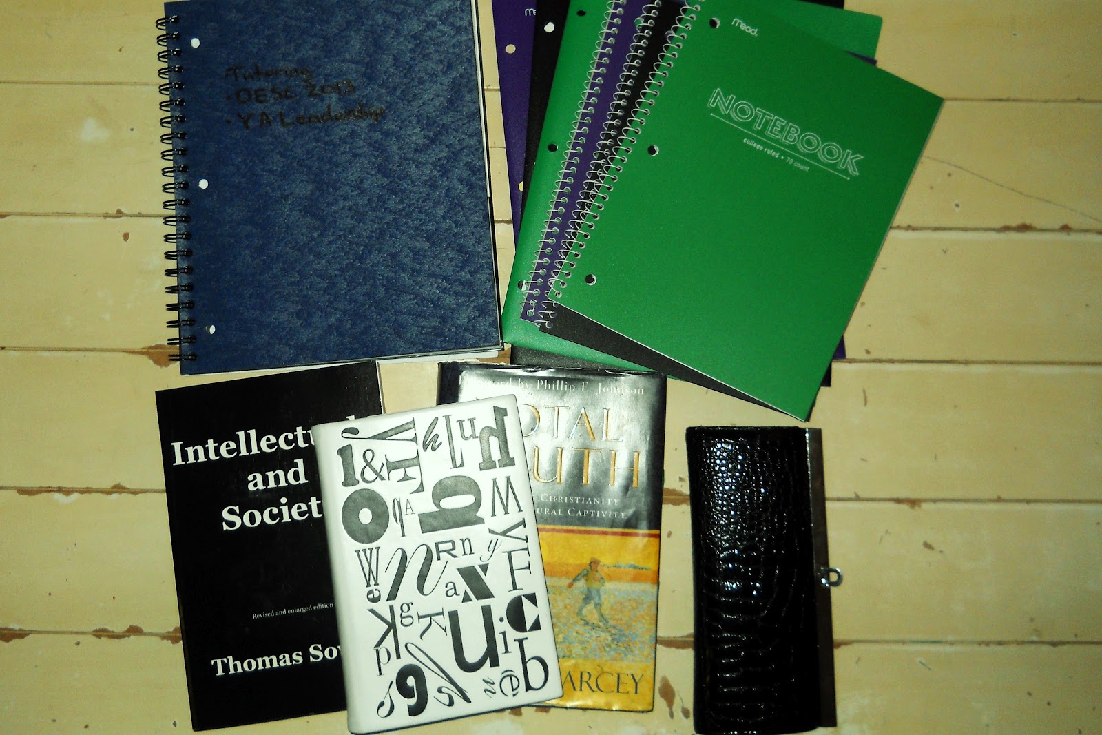 The main compartment of my bag holds my tutoring and volunteer work notebook, my class notebooks and folders, my wallet, and, because I don't have any book reading assigned for my classes yet, my Nook with the awesome Jonathan Adler cover I bought for it, Intellectuals and Society by Thomas Sowell (a book I just started reading), and Total Truth by Nancy Pearcey (a book I'm almost done reading). Not pictured because I was using it to take these pictures: my camera, which is usually in one of the elastic side pockets inside the main compartment.